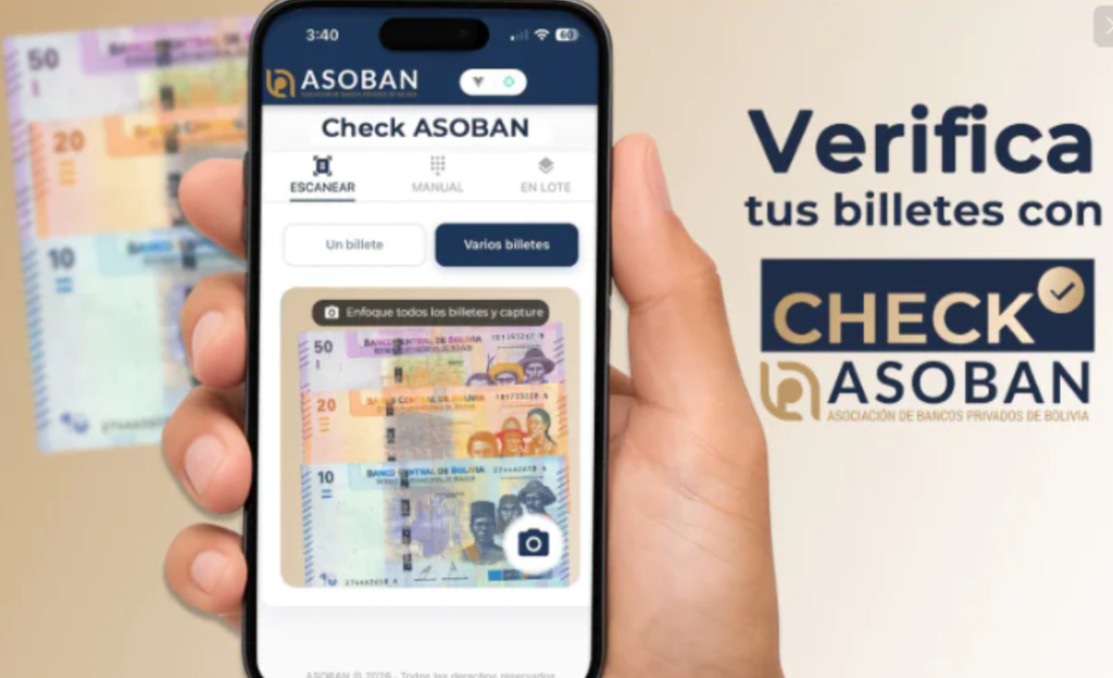 A través del portal www.asoban.bo, los usuarios pueden acceder a la opción «Check Asoban» para verificar la validez de su dinero.